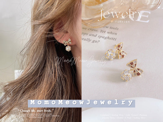 Checked Bow with shiny pendant earrings | 鸳鸯砂糖棋盘格耳钉